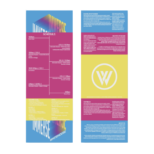 During my tenure at the university, I was selected to oversee the Whitehouse Open House event. Serving in the capacity of a graphic designer, my responsibilities extended to the realisation of the ‘Immerse’ campaign through the creation of both digital & print promotional materials, in addition to the conceptualisation of the event design. Furthermore, I assumed the role of a runway producer, overseeing casting, HMUA, photographers, fashion designers, set design & backstage schedule; ensuring seamless execution.